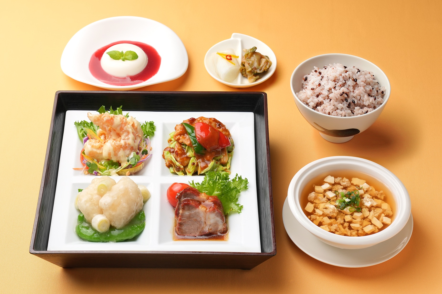 ・大山鶏と豆腐のとろみスープ ・窯焼チャーシュウ ・白身魚と スナップエンドウの香り炒め ・海老のマヨネーズソース ・和豚もちぶたの特製味噌炒め ・白米 又は 古代米 ・杏仁豆腐 山桃シロップ